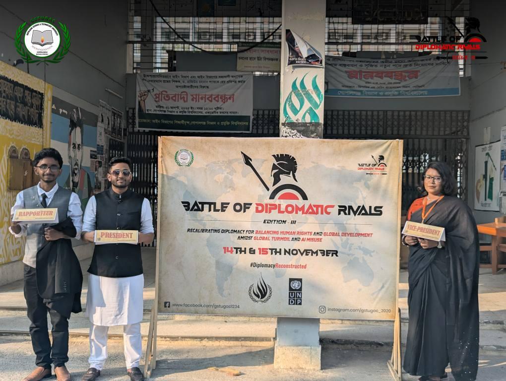 With a vision to empower students through international exposure and skill-based learning, the GSTUGAC has consistently served as a platform for critical thinking, global dialogue, and cultural exchange. GSTU Global Affairs Council (GSTUGAC) has been a driving force in enhancing the diplomatic, analytical, and leadership skills of GSTU’s students. Over its five years of success, the council has proudly hosted and contributed to numerous MUNs, workshops, and conferences at the national & international levels that inspire global thinking and intellectual growth. Continuing this legacy, GSTUGAC presents Edition III of ‘Battle of Diplomatic Rivals’ on 14th & 15th November, 2025.